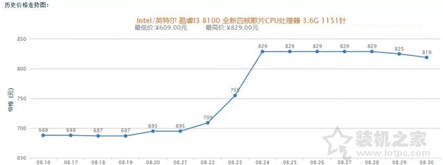 目前intel酷睿i3-8100处理器散片价格从去年的600元左右,截止8月30日目前涨到了820元左右,涨价幅度超两百元。