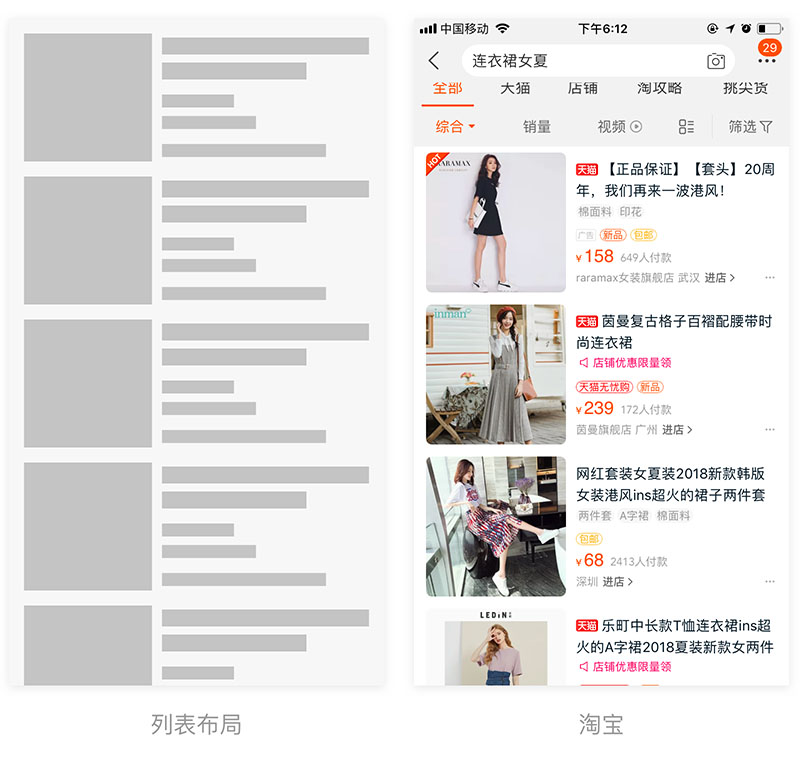 列表布局也就是我们常见的图文列表,一个列表垂直呈现多个连续的行元素。列表布局重在文本内容,由于图片尺寸较小,因此图片细节展示不丰富。最常见的使用场景就是电商、团购类列表,如:淘宝、大众点评等。
