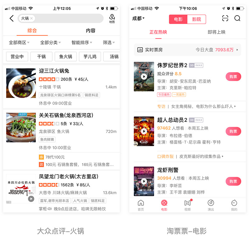 以淘票票为例:图片主要起到视觉引导的作用,而用户需要看的就是打折的详细信息,因此采用列表布局有利于商品的对比使用。