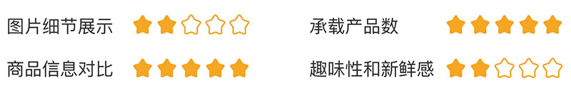 综上,如果满分是五颗星,那么列表的图片细节展示较差为 2 颗星;承载产品数多为 5 颗星;商品信息对比强为 5 颗星;趣味性和新鲜感低为 2 颗星。