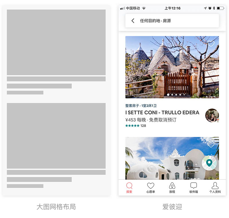 大图网格布局,也就是指一行只展示一张图片,由于其图片占比较大,因此往往一屏只能展示 1 到 2 张,图片细节能够清晰展现,用户可直接根据图片进行商品对比。最常见的使用场景就是以图片为主的APP推荐列表,例如:爱彼迎、蚂蚁短租、懒人周末等。