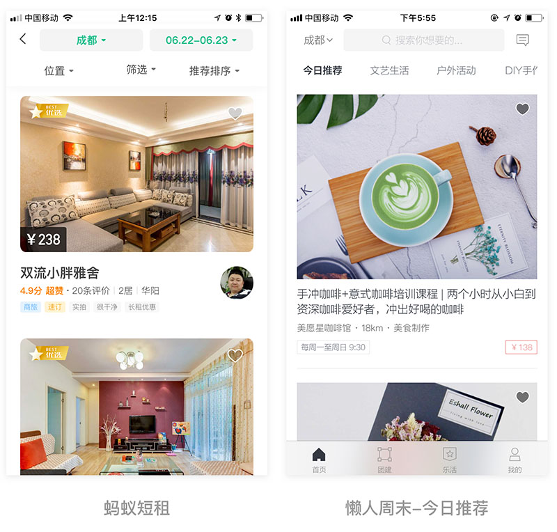 以蚂蚁短租和懒人周末为例,虽然他们一个是短租类APP,一个是生活类APP。其共同点是他们的图片都是经过专人编辑,图片质量较高,同时对界面视觉要求较高,采用大图布局可展示更多的细节,帮助用户筛选对比,提升整体的界面效果。