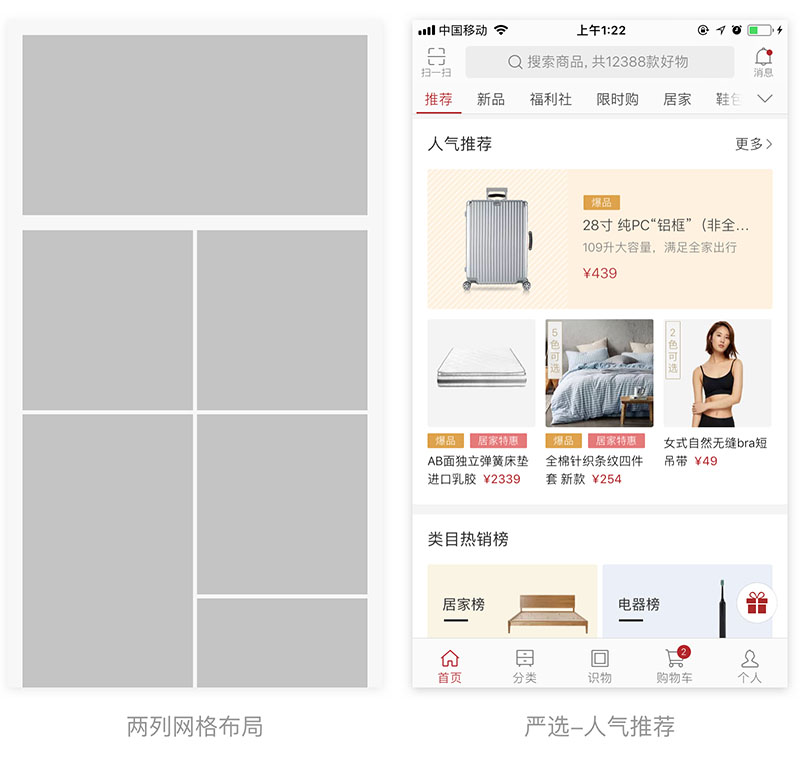 拼图布局往往图片有大有小,小的也很容易被忽略,同时编辑成本高,往往适合平台主动推荐的商品列表。我们可以将重要信息放到大图上,次要信息放到小图上。