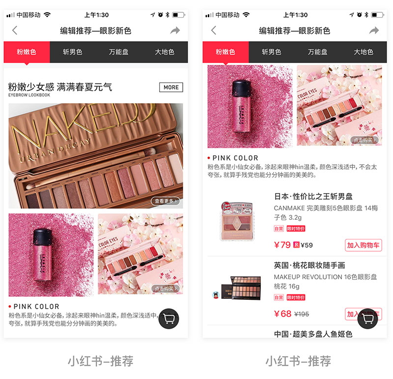 以小红书为例:该页面可看成是专题页,采用拼图的形式展现,从不同角度进行产品的展示,最后在用列表进行产品信息展示,引导用户购买。