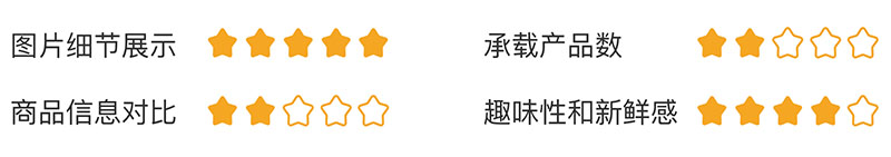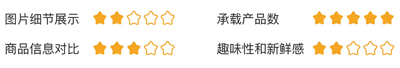 综上,如果满分是五颗星,那么两列拼图布局的图片细节展示丰富为 5 颗星;承载产品数较少为 2 颗星;商品信息对比较弱为 2 颗星;趣味性和新鲜感较好为 4 颗星。