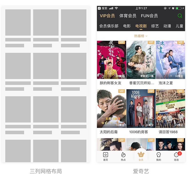 三列网格布局主要用于用户无目的操作,产品数量较大时使用,和列表式的区别是列表式以文字为主进行对比,而三列网格布局主要以图片进行对比