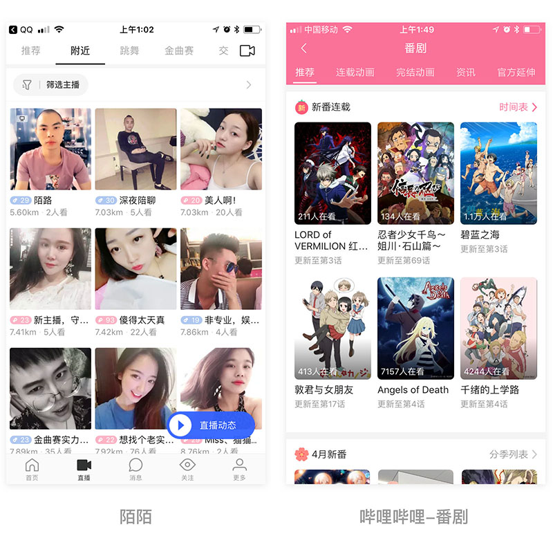 以陌陌直播附近和哔哩哔哩番剧为例,这两个栏目用户在使用时目的性都较弱,用户的需求是通过查看图片进行快速筛选和对比。对于图片细节展示要求不高,对于趣味性和新鲜感要求也不高。