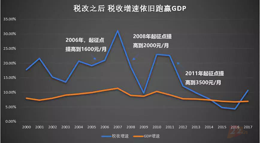 2006年提高个税起征点,结果2006年的税收为3.48万亿元,比2005年同比增长了20.94%;2008年再次提高起征点,虽然只提高了400块,但当年税收增加了8600多亿元;2011年再税改的时候,税收增速达到22.58%,是GDP增速的2倍多。