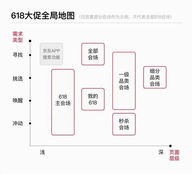 以 18 年 618 为例,把所有页面通过“寻找、挑选、唤醒、冲动”四种类型对应地铺开,就会清晰很多了。当然,页面与页面之间会有些定位和功能上的重合,免不了在纵轴上造成重合,这时候再通过页面层级的横轴来把它们拉开,就是一个 618 大促活动的全局地图。
